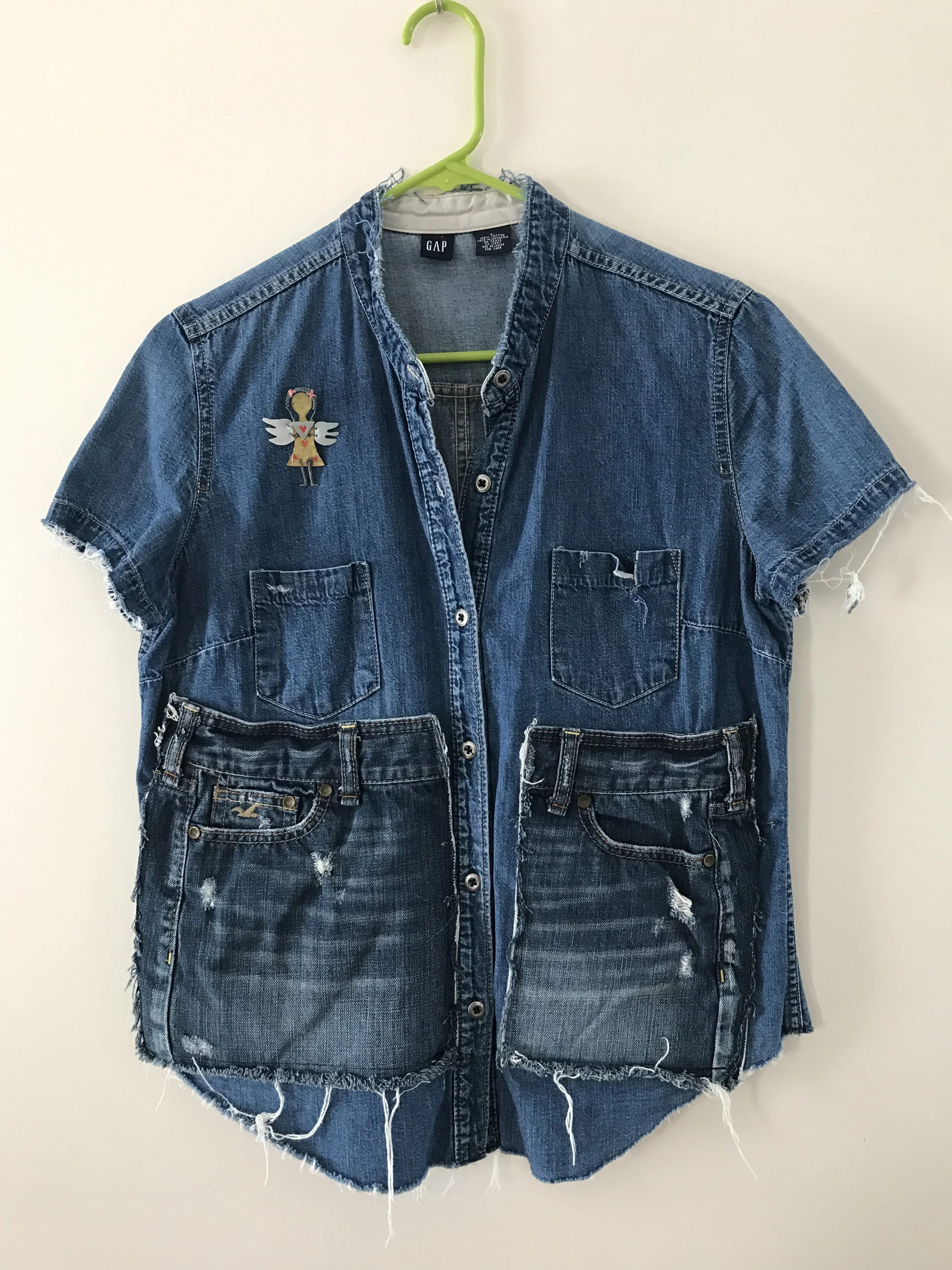 Imperfection is sacred here. Thrifted denim is a magical canvas, glistening paint splatters whisper peace, raw edges hold hidden power, mottled handmade papers are infused with potentiality.